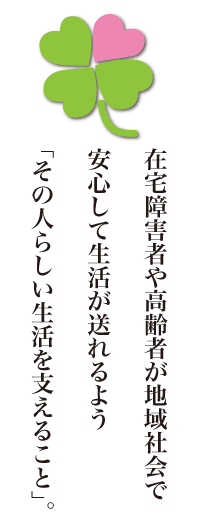 私たち、特定非営利活動法人つどいのスタッフ全員は、訪れる在宅障害者や高齢者が地域社会の中で、安心して生活がおくれるように「その人らしい生活を支えること」を基本理念に日々活動しております。